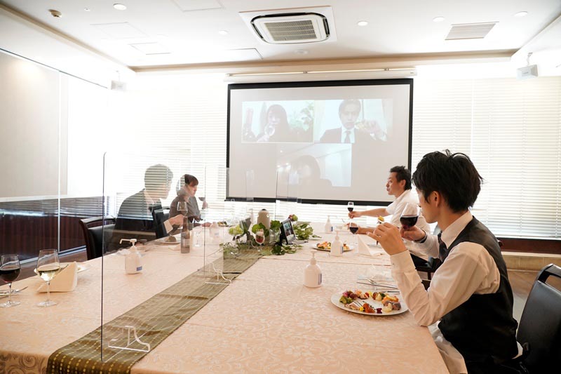 本来は大人数のパーティやご宴会に対応できる大型レストランですから、お料理の準備も問題なく対応できます。ご利用が多いのは企業さまの懇親会や総会などで、会場に4~6名、オンラインで20名の計30名というところですね。